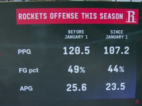 赛前,ESPN的电视节目当中给出了火箭本赛季一月前后的部分进攻数据对比,详情如下(以下均以美国当地时间计算):