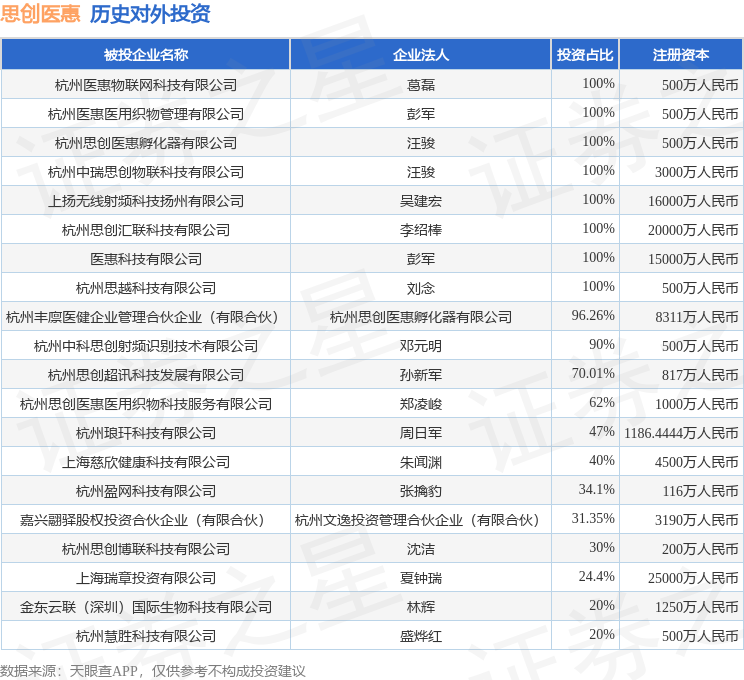 本站消息银易配资网,根据天眼查APP显示,思创医惠(300078.SZ)新增一起对外投资事件,被投资公司为杭州思创博联科技有限公司,法定代表人沈洁,投资占比为30%。该公司从事软件和信息技术服务业,注册资本为200万人民币。目前,思创医惠共存在对外投资32项,投资占比前20的项目见下表: