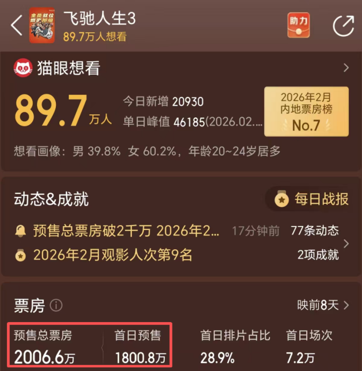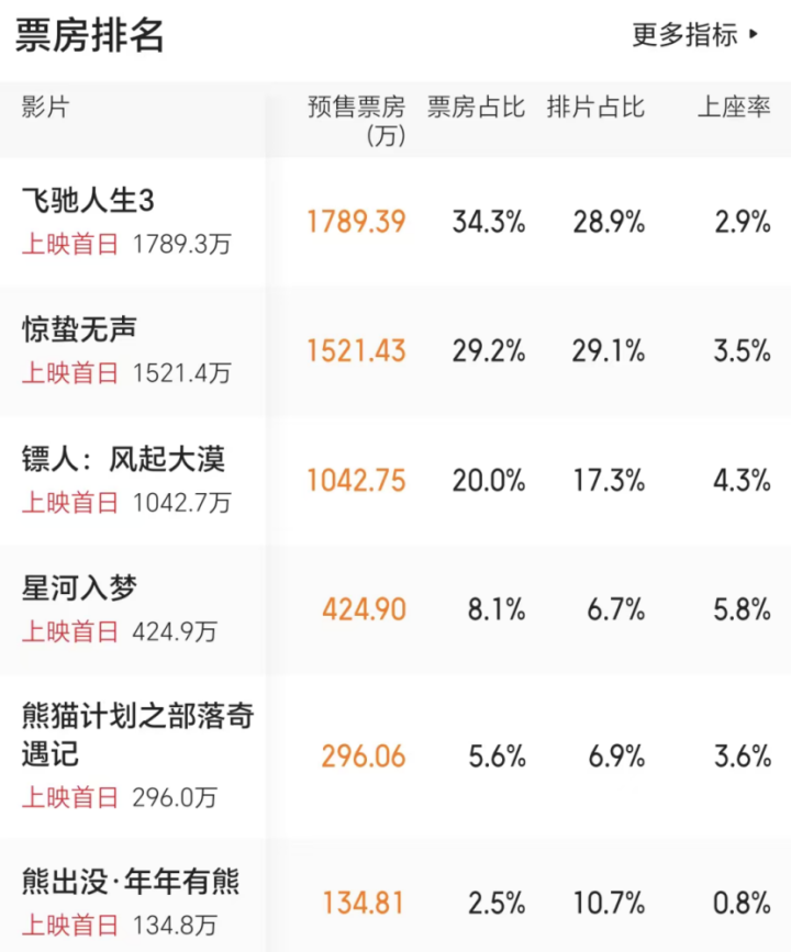 预售票房:134万,排片占比10.7%