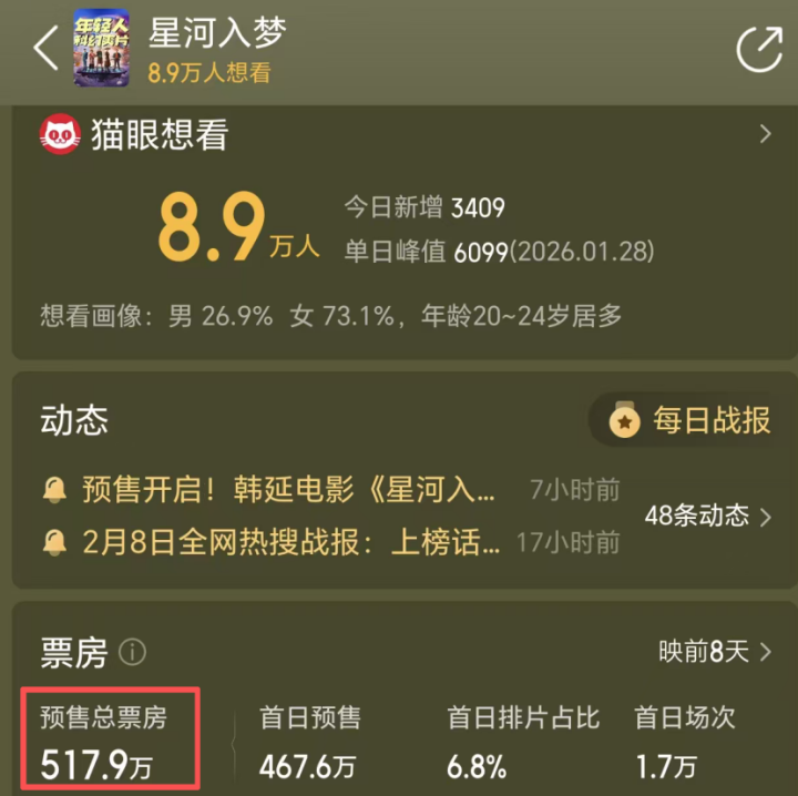 整体来看,《星河入梦》的首日预售表现不错。